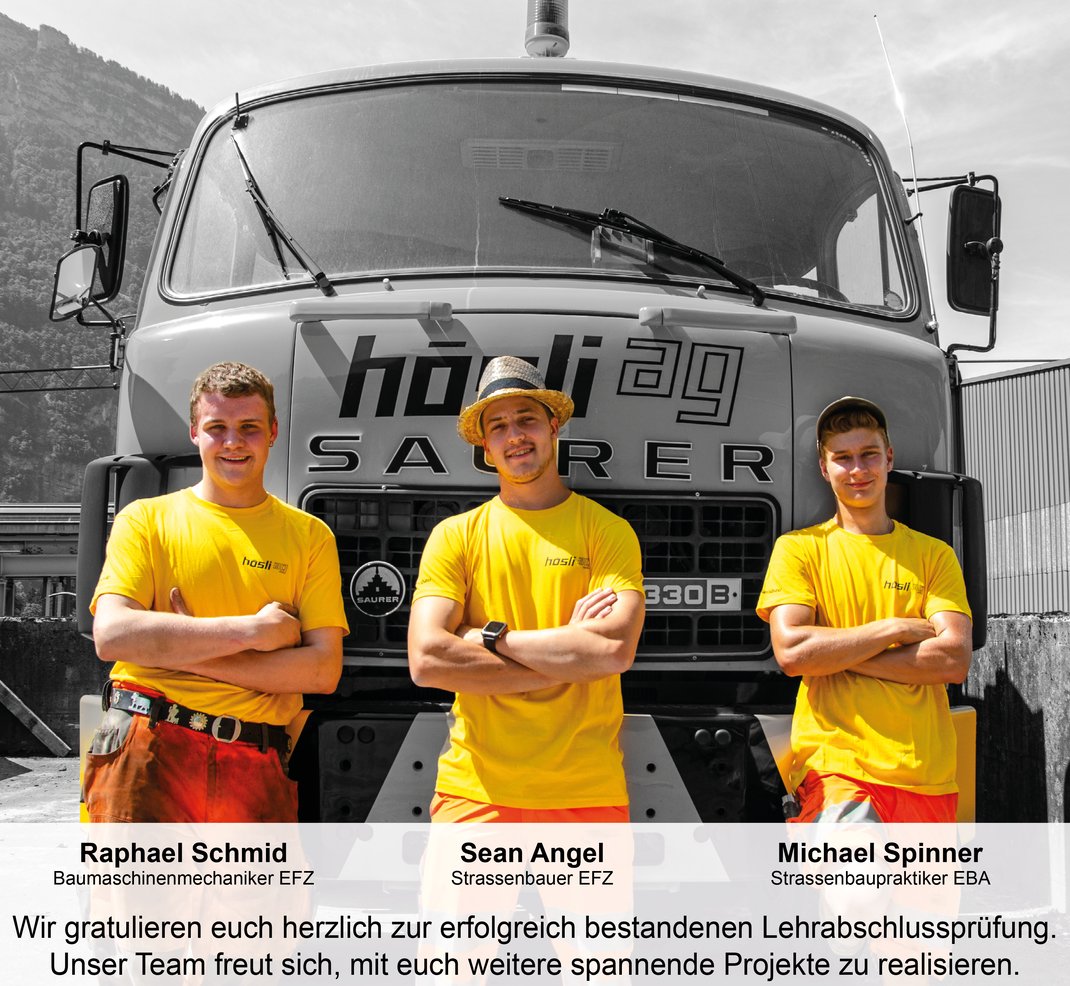 Nach einer intensiven Lehrzeit bei uns haben dieses Jahr Samim Sohrabi, Tobias Brönnimann und Andrin Müller Ihre Abschlussprüfungen zum Strassenbaupraktiker EBA bzw. Strassenbauer EFZ erfolgreich abgeschlossen. Wir gratulieren herzlich und wünschen ihnen einen guten Start ins Berufsleben.