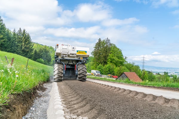 Dazu wurden Sickerleitungen entlang der Strasse erstellt und die Strassenentwässerung ersetzt. Im Anschluss wurde in Zusammenarbeit mit der Firma Eberhard der bestehende Untergrund stabilisiert.